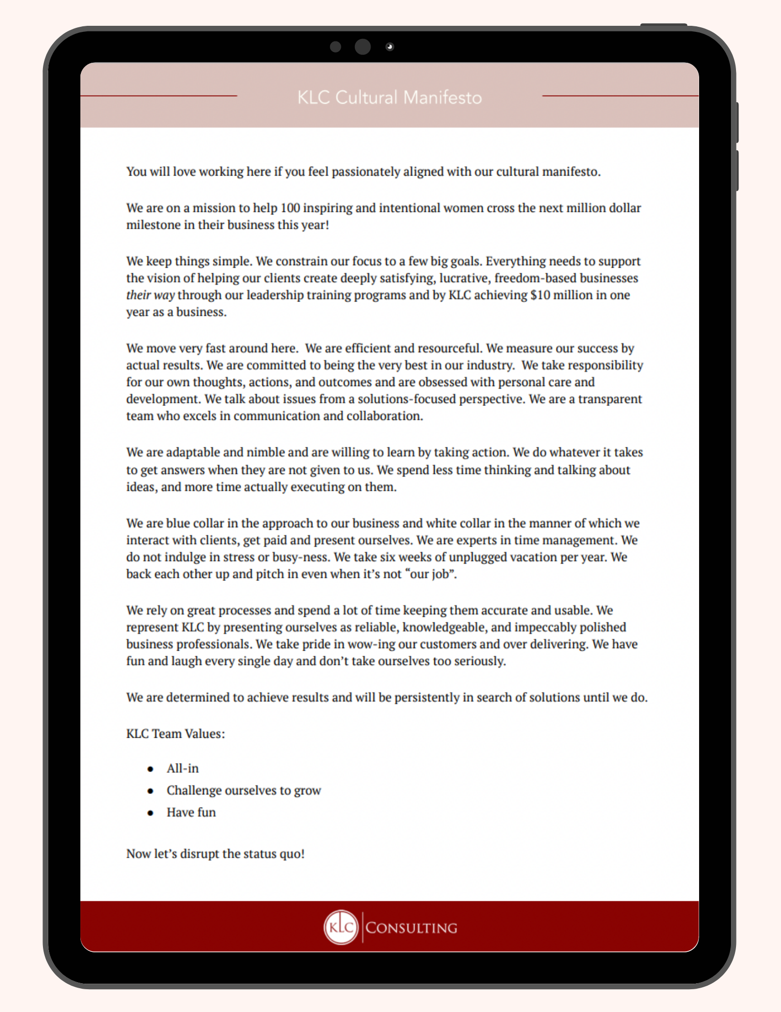 All of the work you’ve done through creating your company’s vision, core values and mission will be included in your Cultural Manifesto. It is a statement of who you are, what’s expected, and how you operate.